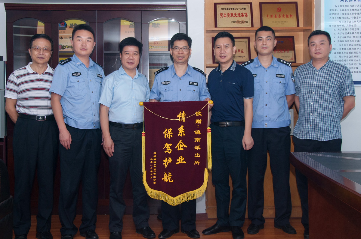 5月24日上午,海雅集团李文生副总裁、涂荣芳等领导一行来到市公安局镇南派出所,将一面写有“情系企业,保驾护航”的锦旗送到该派出所所长肖卓东手中。